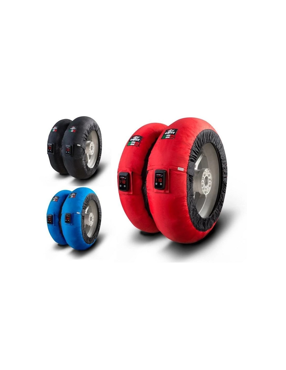 The difference from the competitors is the quality of product and service Capit, 100% made in Italy used by all the top teams MotoGP, Superbike and F1, warranty of three years and guaranteed repair service even out of warranty. Ability to customize the product logo, purchase of spare parts or even a single tyrewarmer. The pair of tyrewarmers can be ordered in the following sizes: