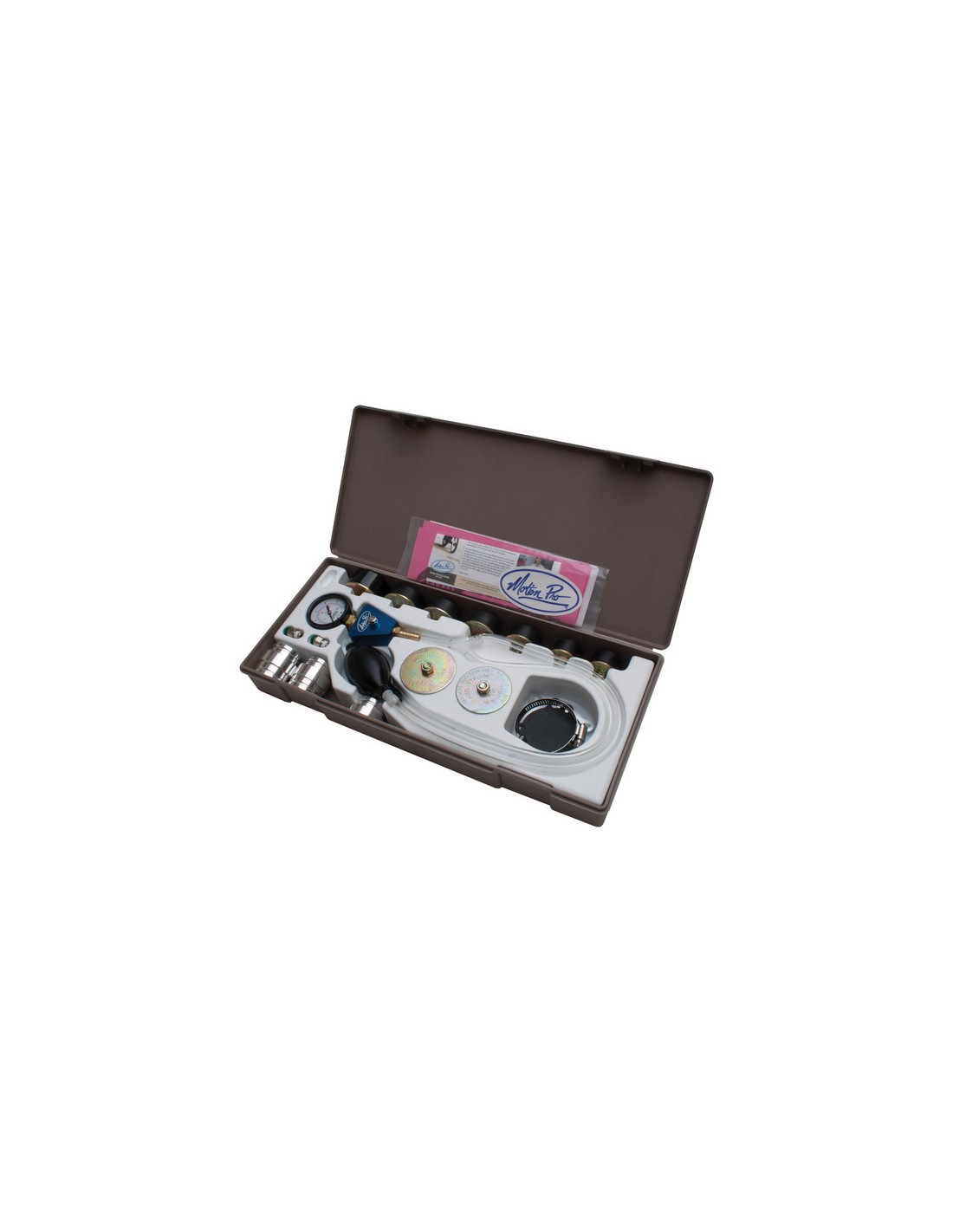 Conceput pentru a verifica scurgerile de aer la motoarele în 2 timpi. Include manometru de aer, bec de pompare și majoritatea fitingurilor și adaptoarelor pentru motoare de motociclete cu un singur și dublu cilindru în 2 timpi.